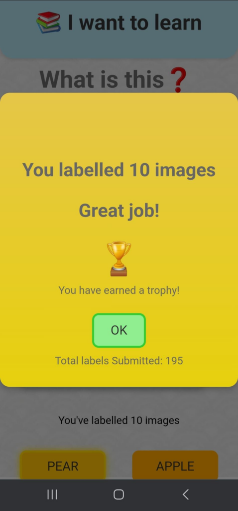 ✅ A reward system that celebrates milestones with a trophy 🏆 when users label a certain number of images.