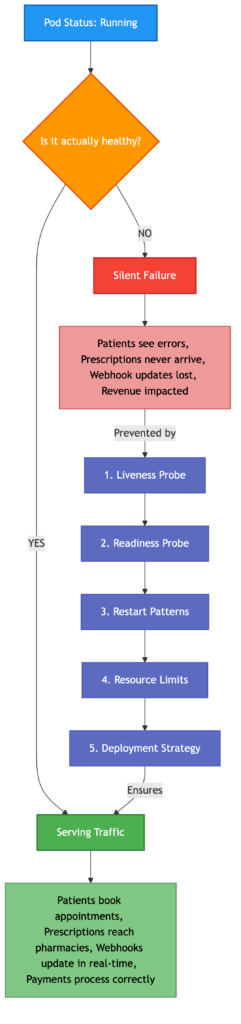 In this context, an unhealthy pod isn’t just a technical issue — it’s a patient who can’t access their prescription, a pharmacy that never receives a dispensing request, or a doctor who loses connection mid-consultation. The stakes are different when healthcare is involved.